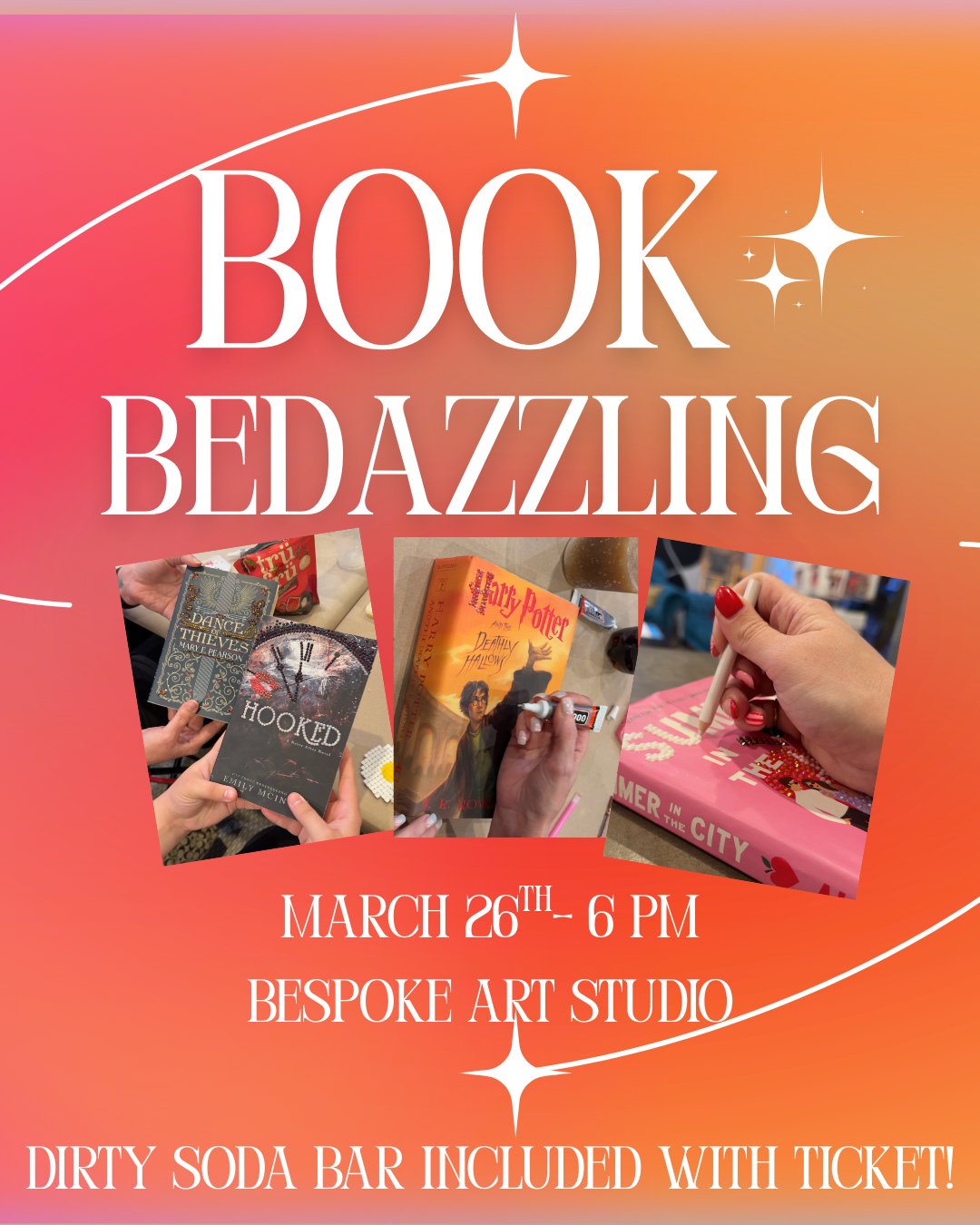 Join us for a sparkling evening of creativity! In this hands-on workshop, we’ll be bedazzling books—just bring your favorite book, and we’ll provide all the rhinestones, tools, and glue you need to make it shine. Or we can print your cover and you can hang your bedazzled piece! Whether you’re adding flair to a journal, a favorite novel, or a keepsake, you’ll leave with a dazzling, one-of-a-kind creation. Perfect for crafters, book lovers, and anyone who loves a little sparkle! We will also be bringing back out dirty soda bar! Everything you need to make your own dirty soda to enjoy while you unwind, gab about books, and bedazzle!